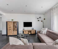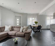 Het gelijkvloers verwelkomt je met een ruime en lichtrijke leefruimte die naadloos aansluit op de stijlvolle open keuken. Daarnaast vind je er een praktische berging met maatkasten die ook dienstdoet als wasplaats, een gastentoilet en de toegang tot de droge kelder die ideaal is als extra bergruimte. Via de tussenhal kom je uit op het aangename terras, volledig afsluitbaar met een elektrische poort.