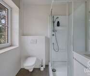Op de eerste verdieping: nachthal, slaapkamer met zolderkamer, tweede slaapkamer en derde slaapkamer met terras en groen uitzicht, ensuite badkamer (ligbad en dubbele lavabo) en aparte badkamer (douche, toilet en lavabo). Tweede verdieping: vijfde slaapkamer en bergruimte.