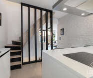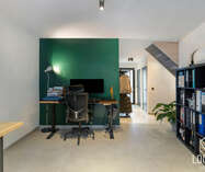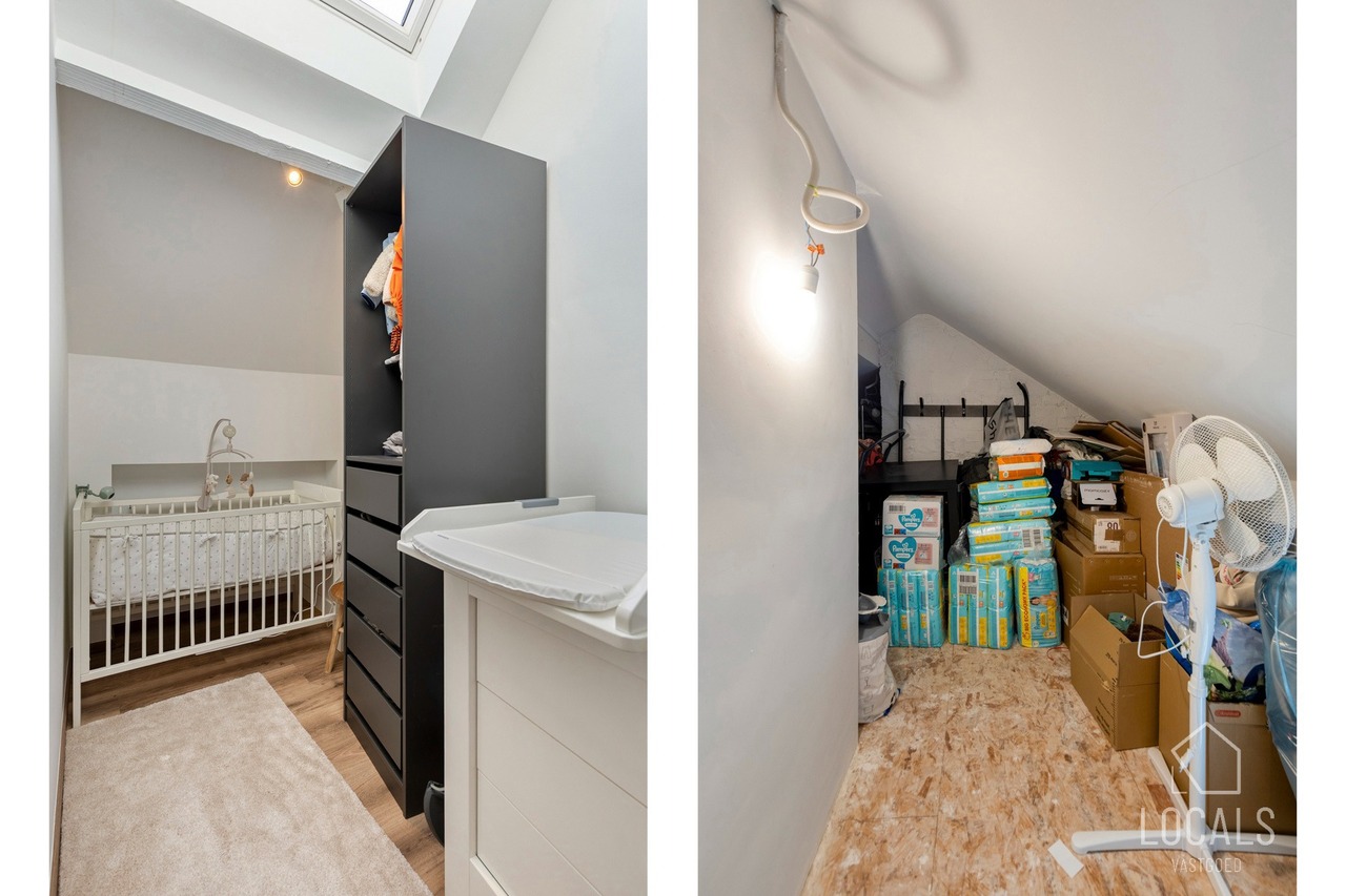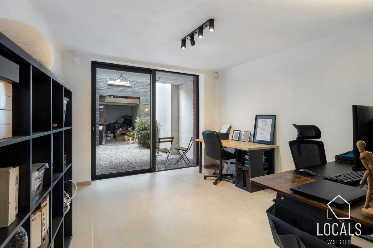 Bij het betreden van de woning komt u binnen in een verzorgde inkomhal met een apart gastentoilet en een praktische berging. Op het gelijkvloers bevindt zich een polyvalente ruimte die perfect kan dienen als bureau, praktijkruimte of extra slaapkamer. Aansluitend is er een eerste buitenruimte met een ruime buitenberging. Op de eerste verdieping bevindt zich de gezellige leefruimte met aansluitend de prachtige volledig uitgeruste keuken met kookeiland. Deze verdieping geeft ook uit op een tweede terras. De tweede verdieping herbergt de masterbedroom, een stijlvolle badkamer met inloopdouche/tweede toilet en lavabo, evenals een extra bureauruimte of babykamer. Via een uitklapbare trap is de zolder bereikbaar die perfect kan dienen als stockageruimte.