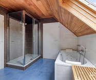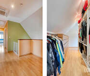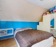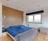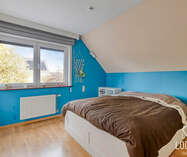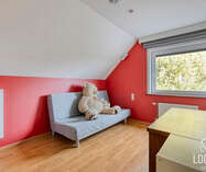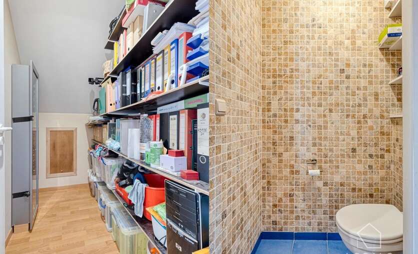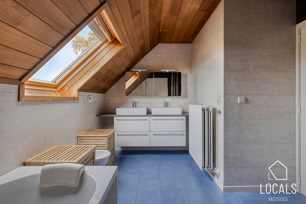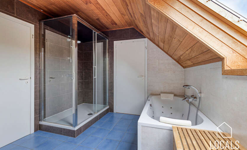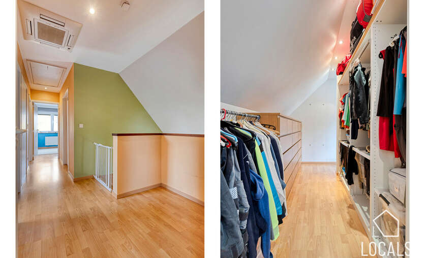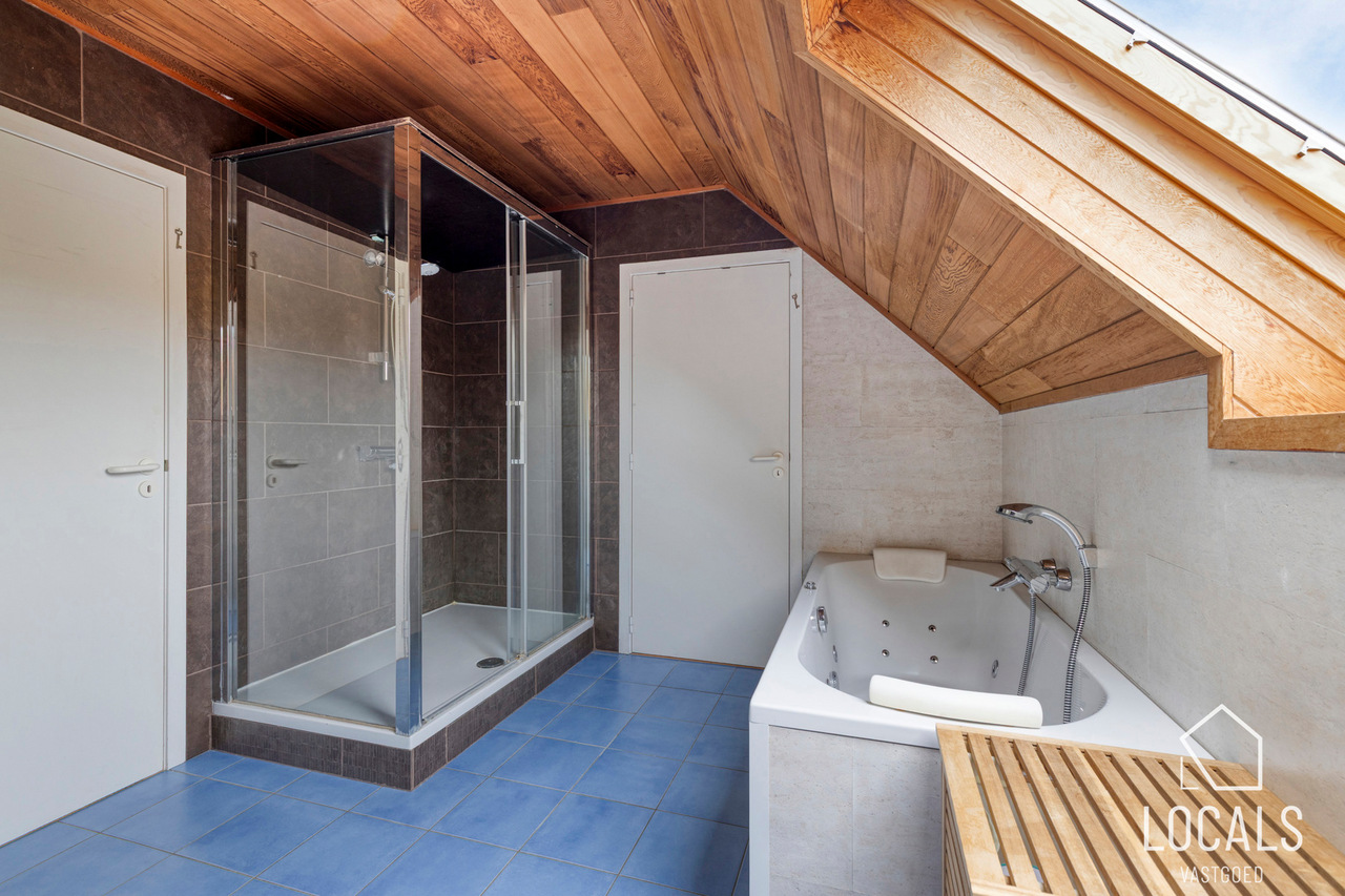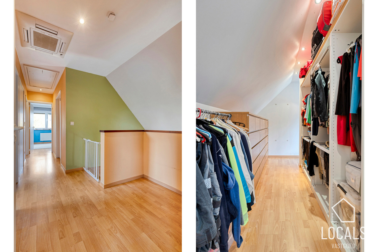 Op de eerste verdieping bevinden zich drie ruime slaapkamers waaronder de master bedroom van 24m² met dressing, een ensuite badkamer uitgerust met dubbele lavabo - grote douchecabine en jacuzzi bad. Verder is er op deze verdieping een tweede toilet en een extra berging. De zolder biedt bijkomende opslagruimte.