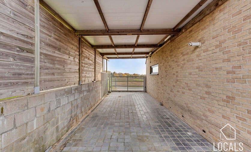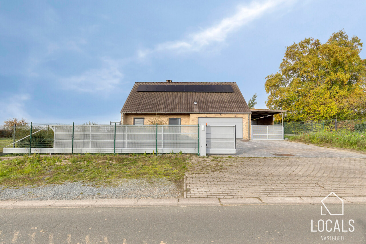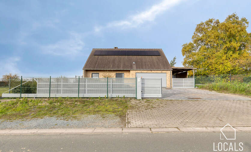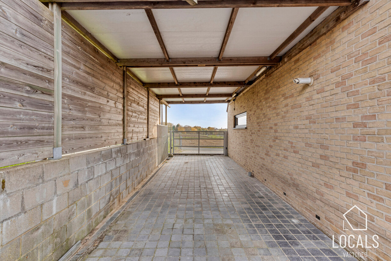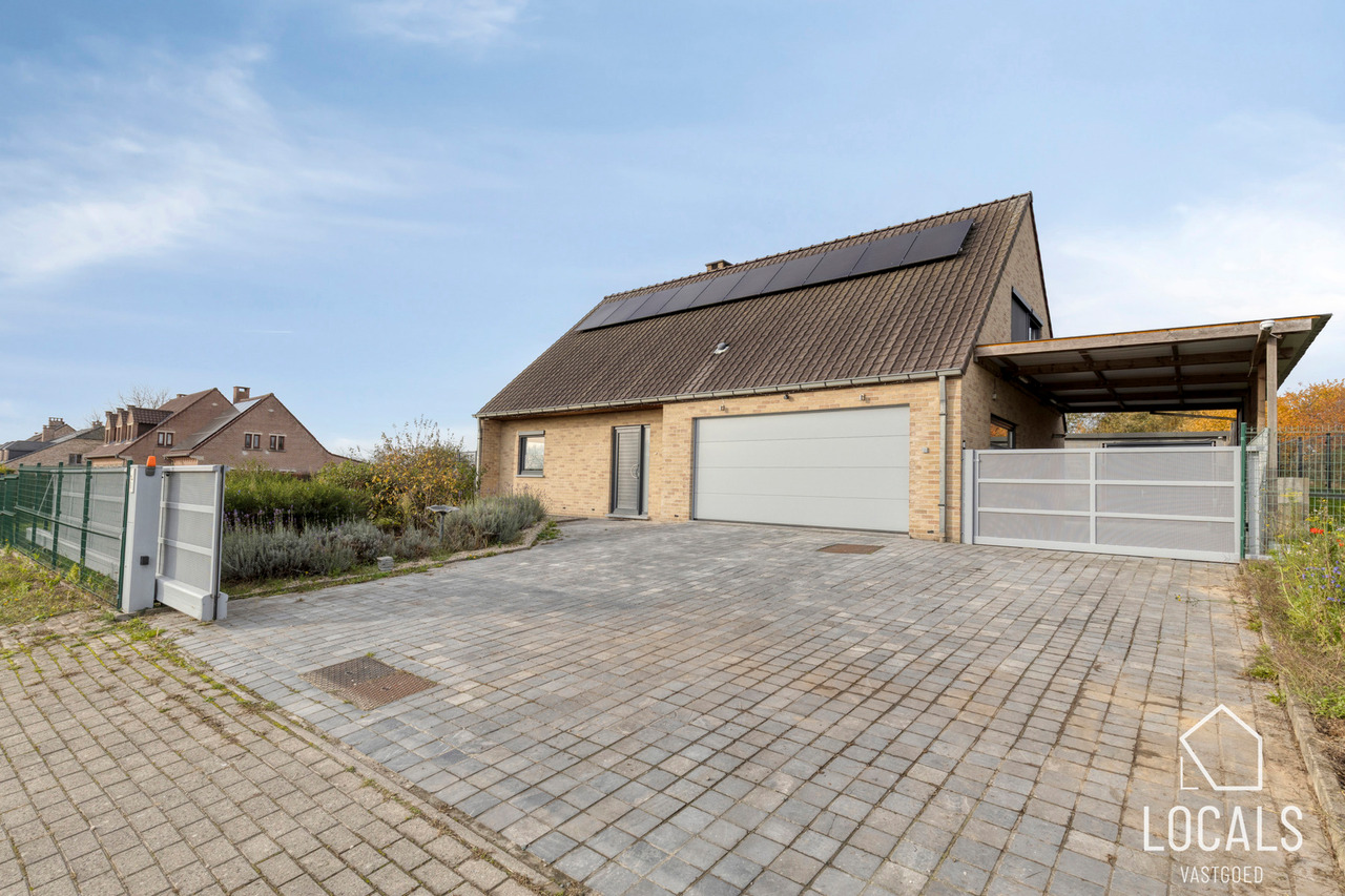 De woning werd voorzien van een dubbele oprit met sectionaalpoort, een carport en een dubbele garage – ideaal voor wie meerdere wagens veilig en privé wil parkeren. Binnen verwelkomt een praktische inkomhal met gastentoilet u in de lichtrijke leefruimte met bureauhoek, waar grote ramen zorgen voor een prachtig vergezicht over de tuin en de omliggende velden. De volledig uitgeruste keuken vormt samen met de ruime berging/wasplaats (voorzien van douchecabine) en de droge kelder het geheel compleet op het gelijkvloers.