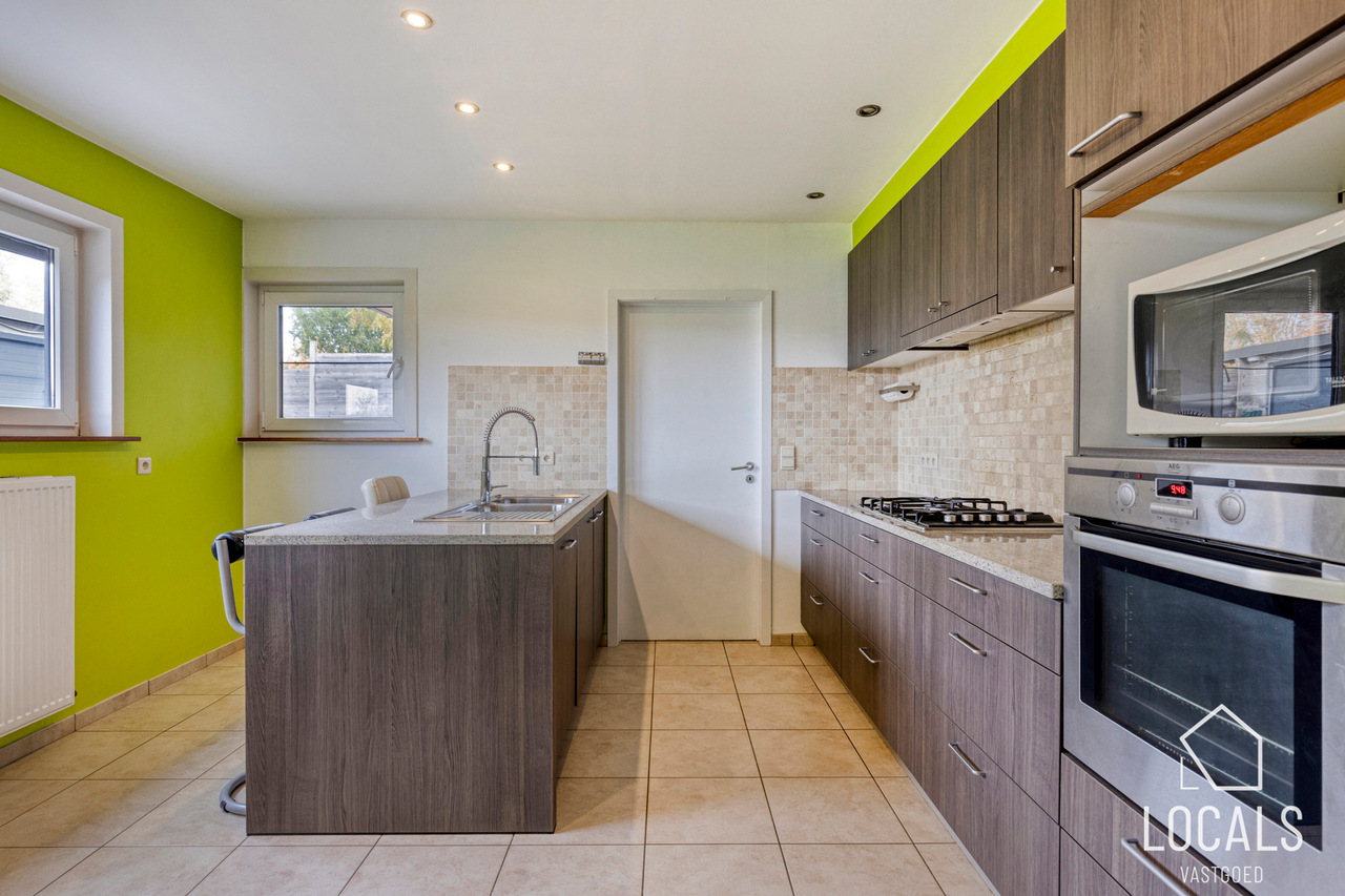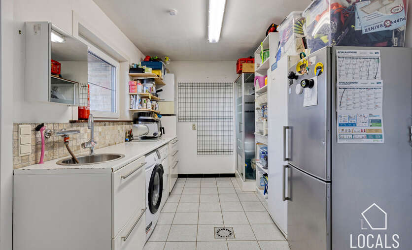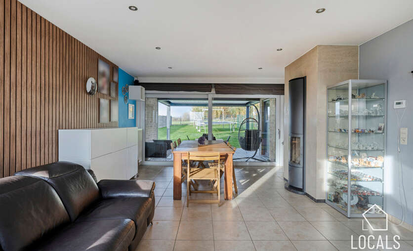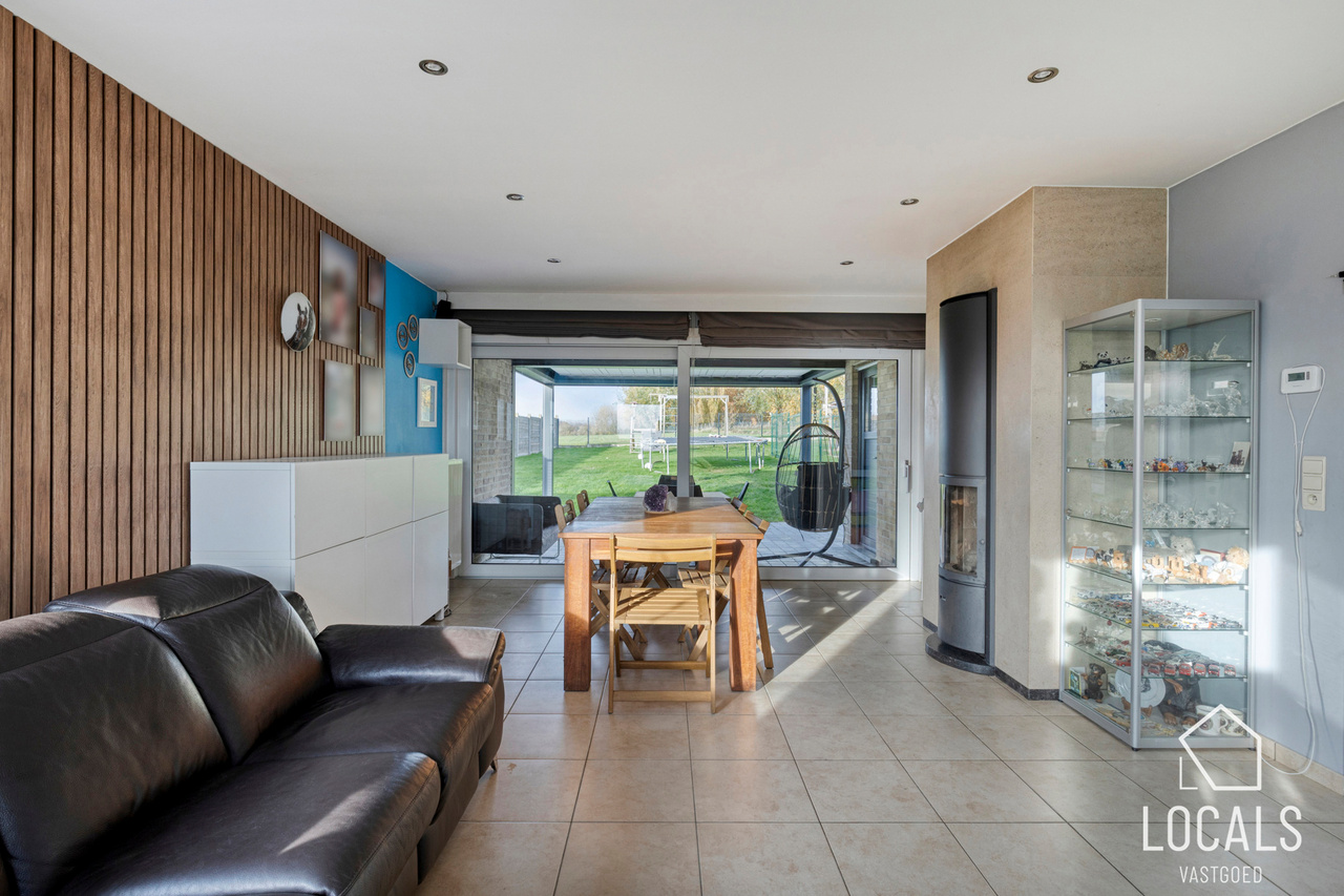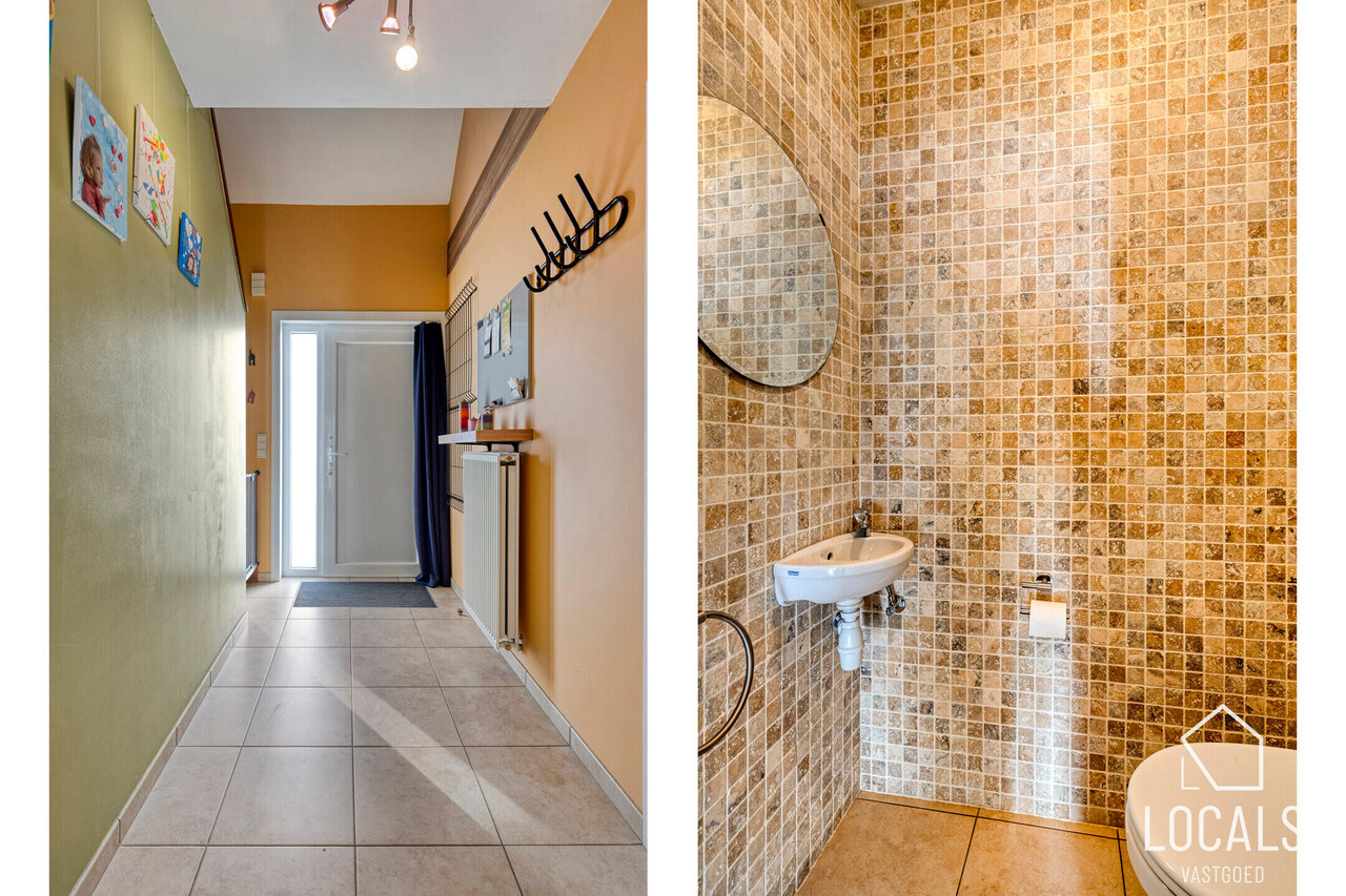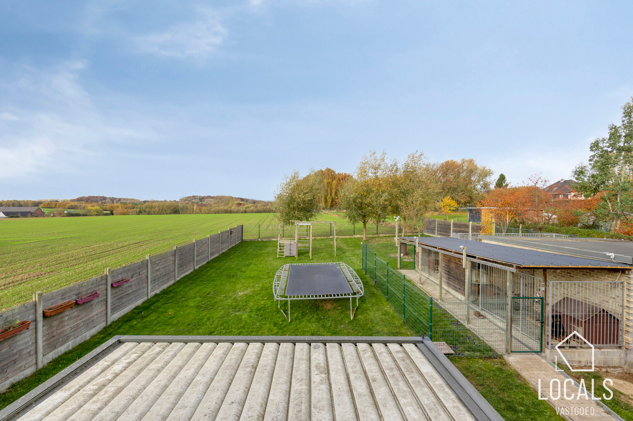 De woning werd voorzien van een dubbele oprit met sectionaalpoort, een carport en een dubbele garage – ideaal voor wie meerdere wagens veilig en privé wil parkeren. Binnen verwelkomt een praktische inkomhal met gastentoilet u in de lichtrijke leefruimte met bureauhoek, waar grote ramen zorgen voor een prachtig vergezicht over de tuin en de omliggende velden. De volledig uitgeruste keuken vormt samen met de ruime berging/wasplaats (voorzien van douchecabine) en de droge kelder het geheel compleet op het gelijkvloers.
