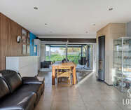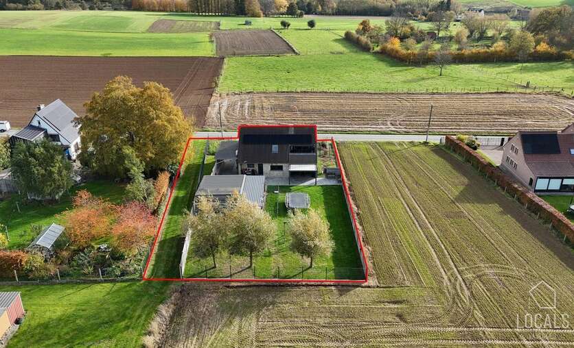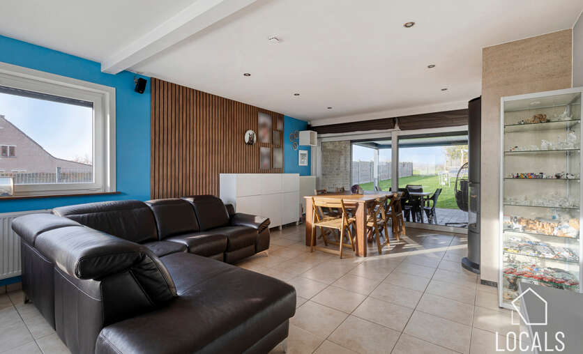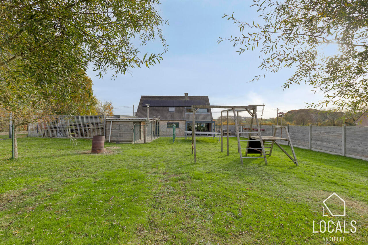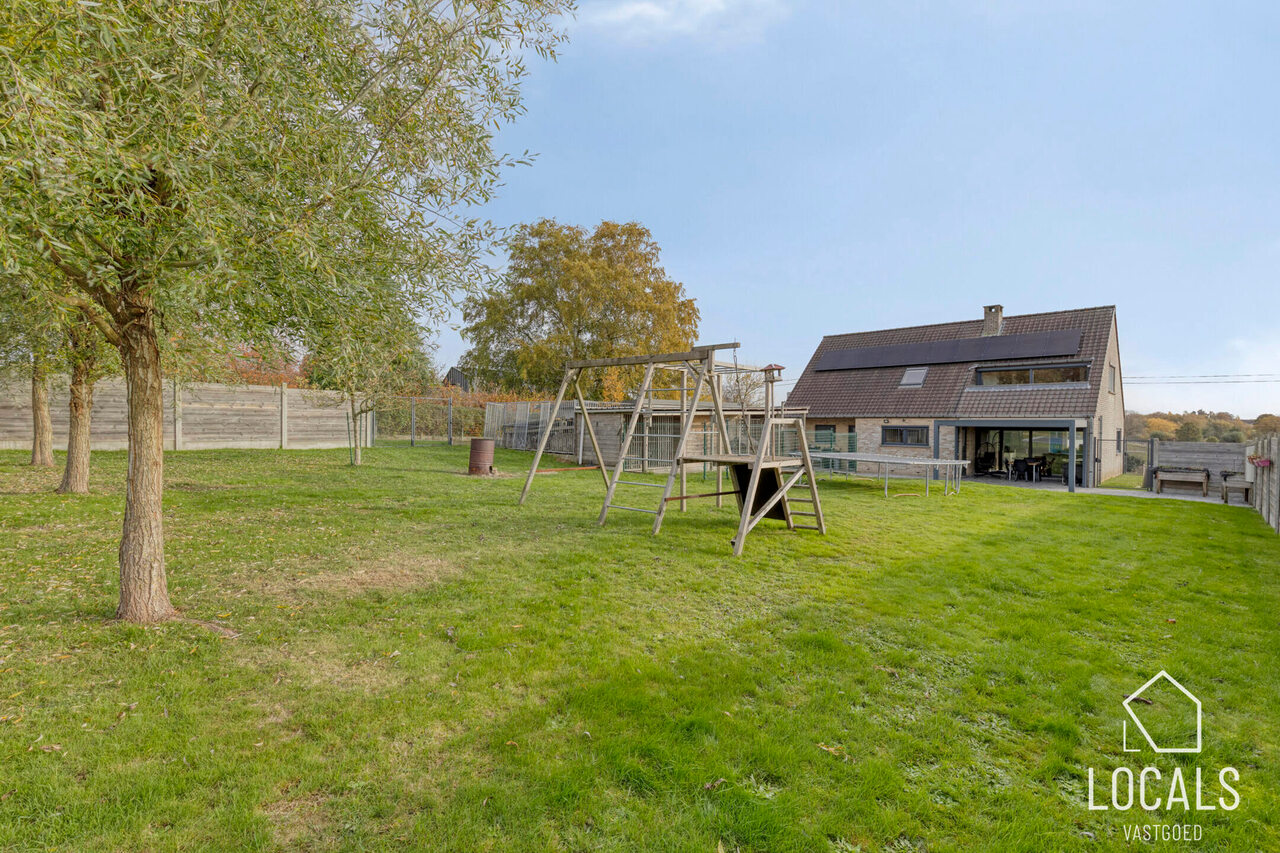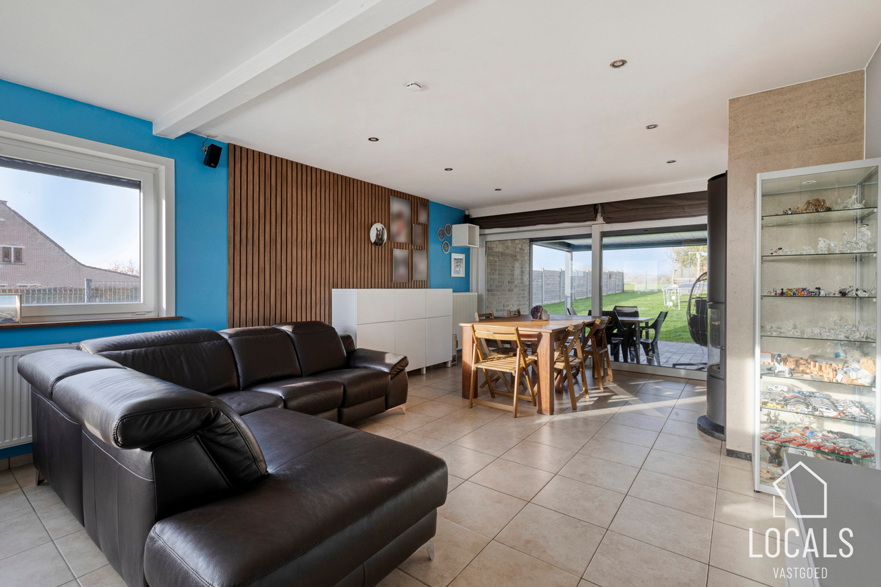 De woning werd voorzien van een dubbele oprit met sectionaalpoort, een carport en een dubbele garage – ideaal voor wie meerdere wagens veilig en privé wil parkeren. Binnen verwelkomt een praktische inkomhal met gastentoilet u in de lichtrijke leefruimte met bureauhoek, waar grote ramen zorgen voor een prachtig vergezicht over de tuin en de omliggende velden. De volledig uitgeruste keuken vormt samen met de ruime berging/wasplaats (voorzien van douchecabine) en de droge kelder het geheel compleet op het gelijkvloers.