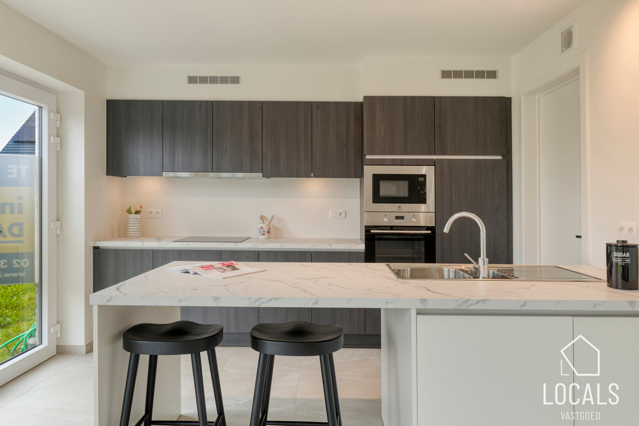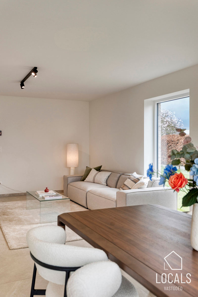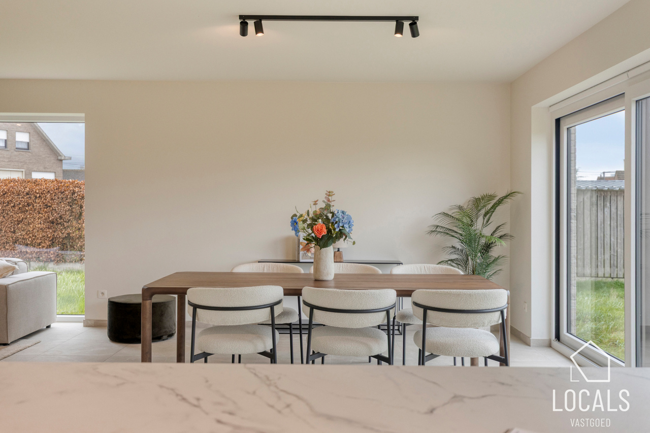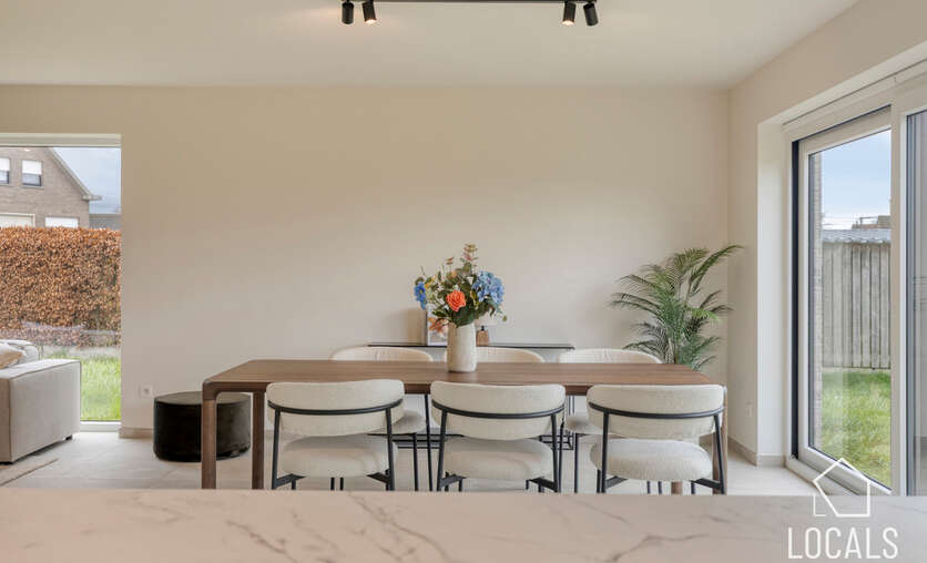 Het gelijkvloers is ontworpen als een open, lichte leefruimte waar functionaliteit en gezelligheid elkaar versterken. De keuken sluit mooi aan op de eethoek, waardoor koken en tafelen een vanzelfsprekende flow krijgen. De zithoek kijkt uit op de tuin en vormt een warme plek om te ontspannen. De inkomhal, het gastentoilet en de inpandige garage zorgen voor extra comfort en praktische meerwaarde in het dagelijkse leven.