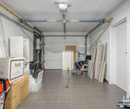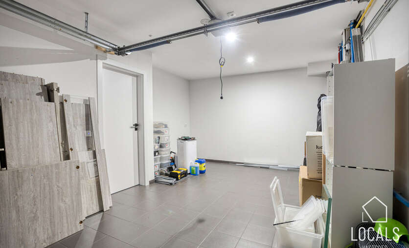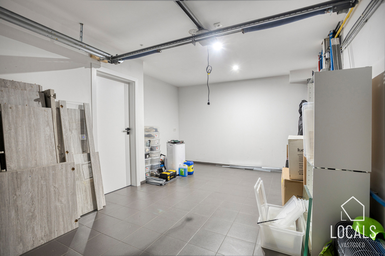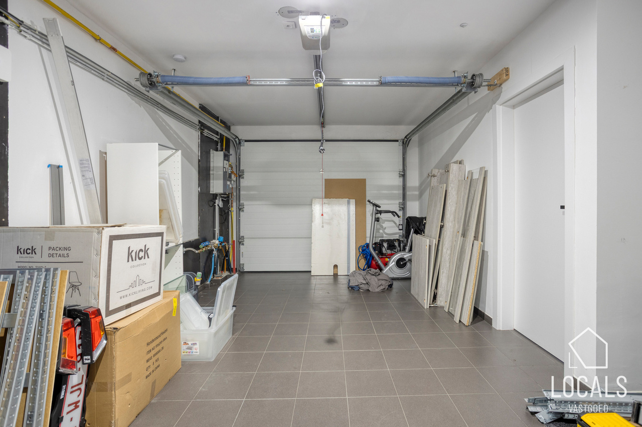 Op het gelijkvloers bevindt zich een gezellige inkomhal met directe toegang tot de ruime garage met automatische poort. Verder is er een lichtrijke leefruimte met grote raampartijen en een halfopen keuken met kwalitatieve toestellen. Een aparte berging zorgt voor extra opbergruimte.