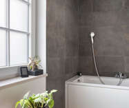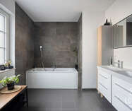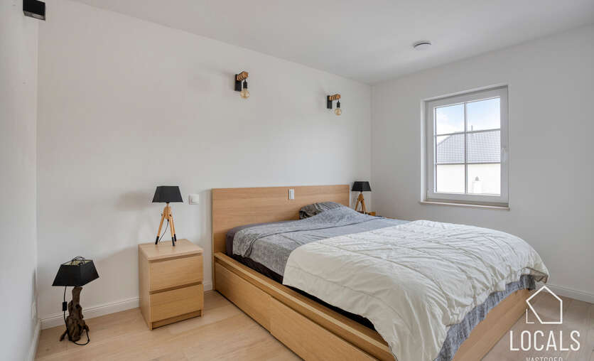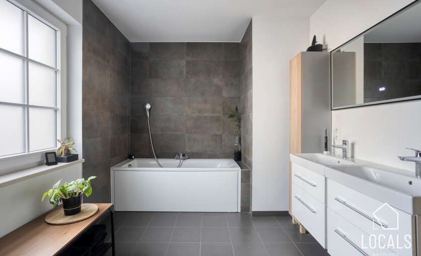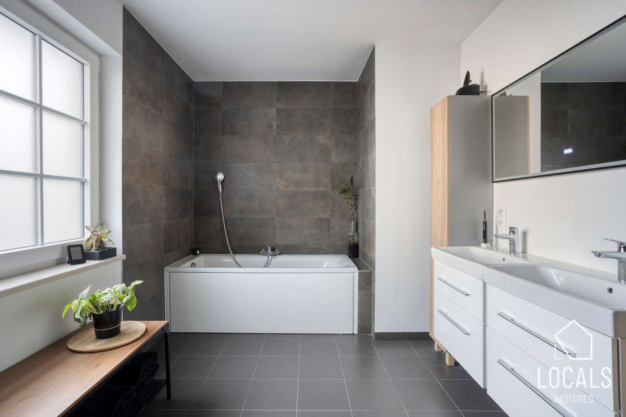 De eerste verdieping telt twee ruime slaapkamers, een volwaardige kinderkamer of dressing, een apart toilet en een moderne badkamer met dubbele lavabo, ligbad en inloopdouche.